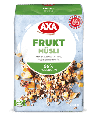 Vi i AXA synes du skal stille store krav til hva du spiser som dagens første måltid. Det er derfor AXA har laget Frukt Müsli – en ekstra smakfull og sunn blanding av havre, hveteflak og ekstra mye frukt.