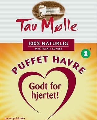 Tau Mølle puffet havre lages av fullkornshavre og inneholder hele 12% fiber.